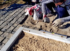 Засыпаем территорию участка пескобетонной смесью и начинаем укладывать брусчатку, одновременно монтируя заранее принесённый памятник.