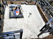 Затем мы застелили территорию участка геотекстилем, обеспечив брусчатке защиту от сорной травы на долгие годы вперёд. Параллельно у основания памятника был установлен небольшой гранитный цветник.