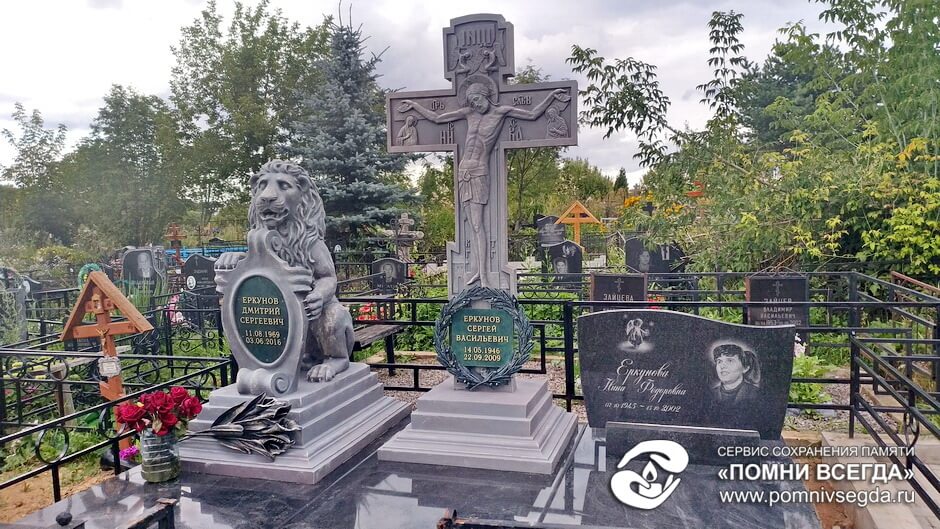 Устанавливаем надгробья. Справа располагается старый гранитный памятник, слева – композиция, изготовленная из полимеров. Скульптуры предоставлены клиентом и были сделаны в другой мастерской, сами они лёгкие, по текстуре и цвету похожи на камень.