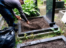 Сметаем с бортов цветника лишнюю землю, после чего переходим к самим надгробьям: вытираем памятники, немного проявляя надписи на их поверхности. Параллельно с этим протираем цветники, окончательно удаляя рассыпанную в процессе посадки землю.