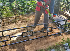 Затем мы сварили по периметру могилы борта из металлических полос, которые и будут являться границей брусчатки. Земля была застелена геотекстилем, который и предотвратит прорастание травы сквозь швы между плитками.
